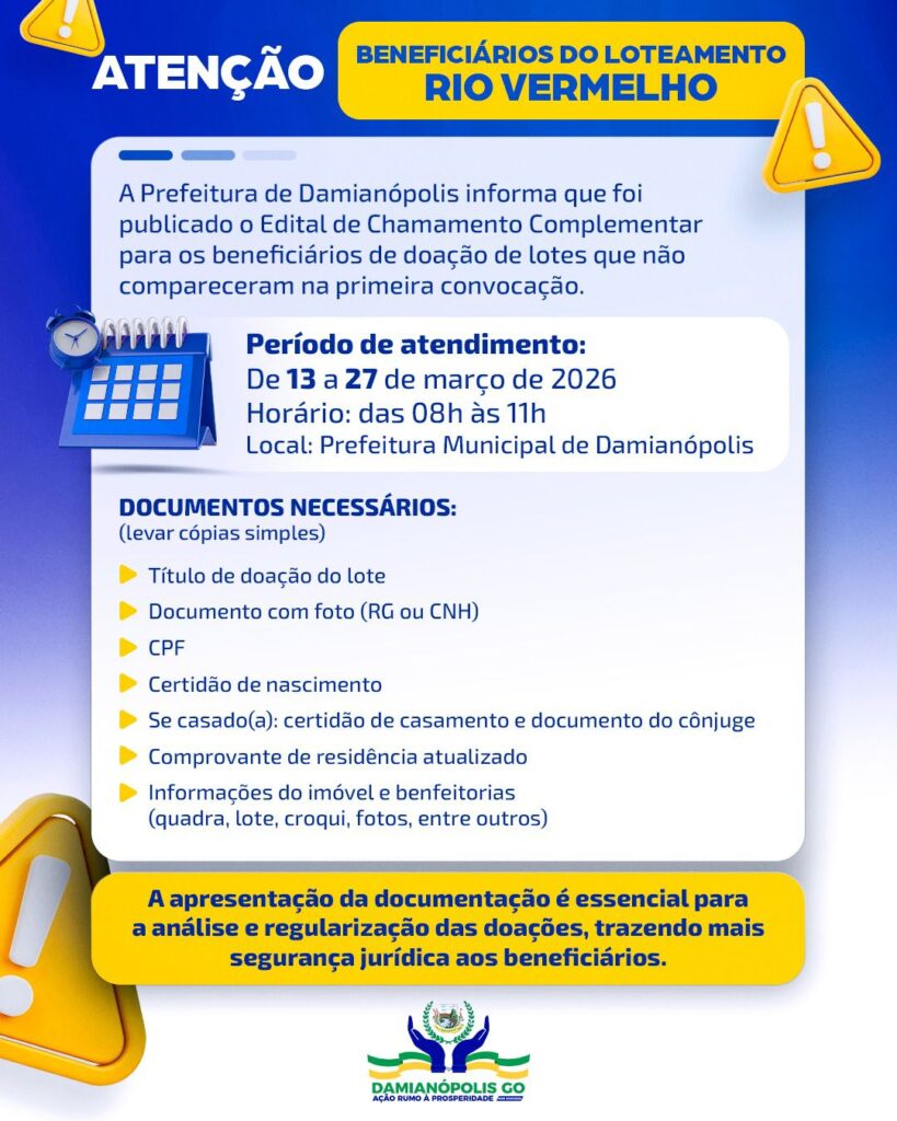 A Prefeitura de Damianópolis publicou o Edital de Chamamento Complementar nº 01/2026 para os beneficiários de doações de lotes no Loteamento Rio Vermelho. Esta é uma nova oportunidade para aqueles que não compareceram na primeira convocação apresentarem a documentação necessária para a regularização dos terrenos.